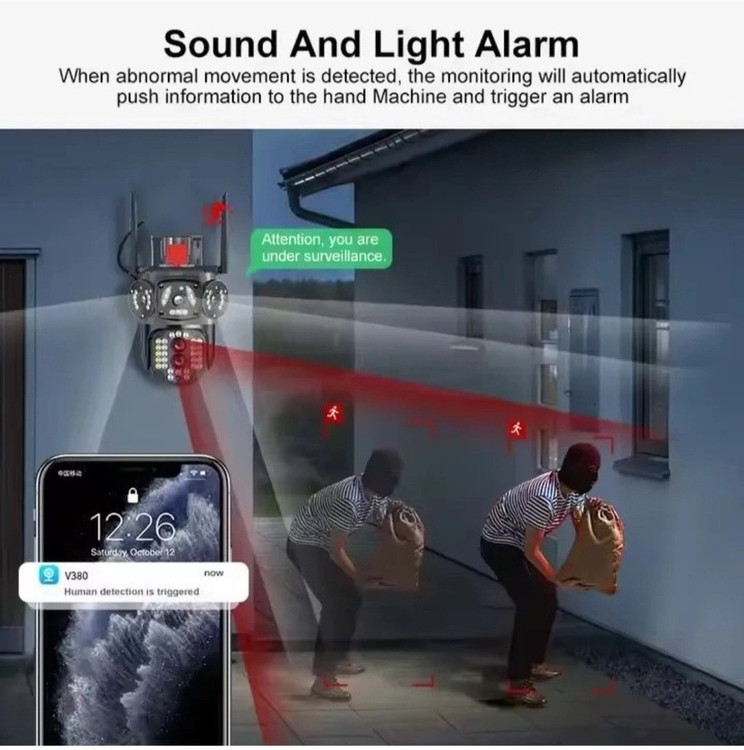 این دوربین سه لنزی مجهز به فناوری تشخیص حرکت است و میتواند در صورت شناسایی حرکت مشکوک، هشدارها را به گوشی یا سیستم مرکزی ارسال کند.